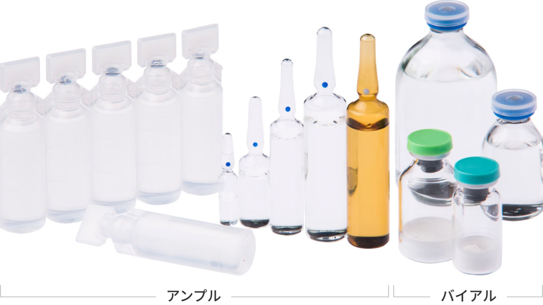 ガラス・プラスチックのアンプル、液・粉末・凍結乾燥のバイアルを合わせたアンプル・バイアル製剤の国内製造量はトップクラスです。製剤の特性に合わせ、ガラス及びプラスチックの素材について最適な提案を行っているほか、ガラス容器の破損を防止するための各種破びん対策の提案も行っています。